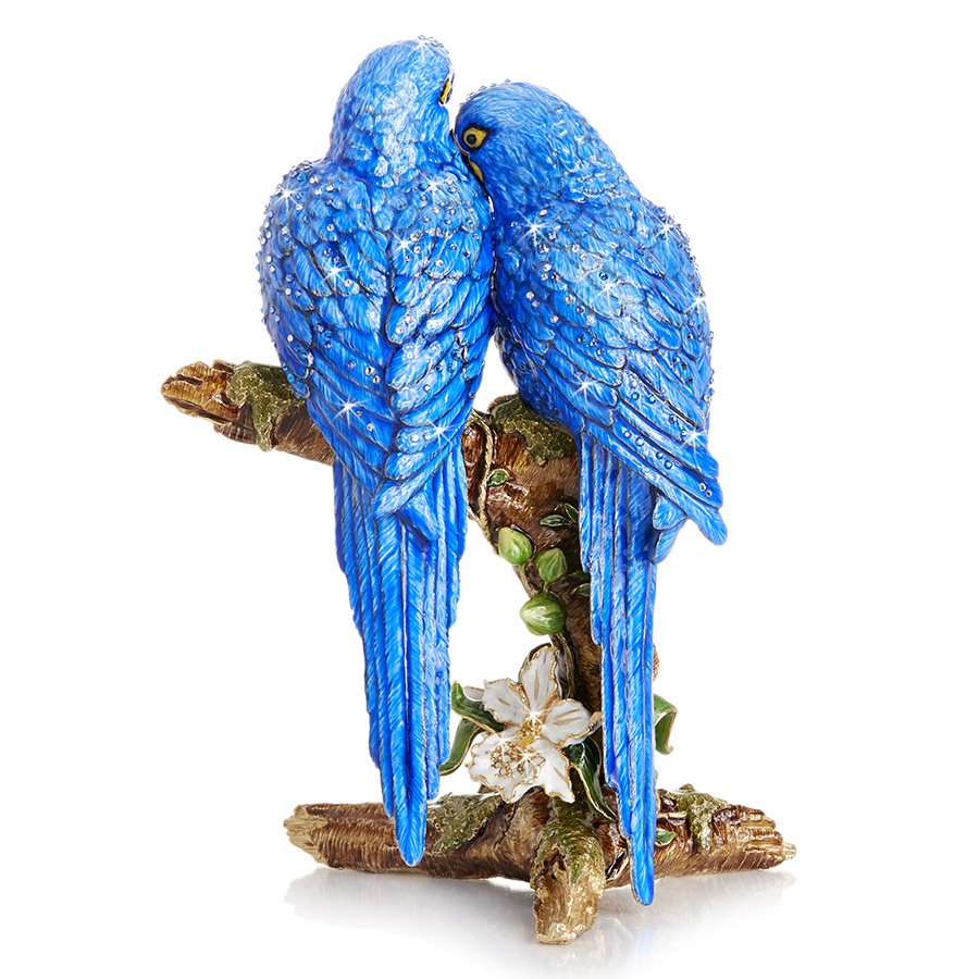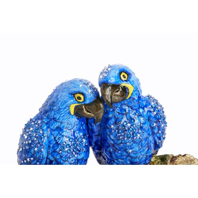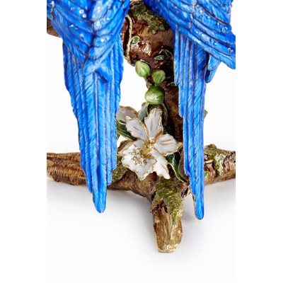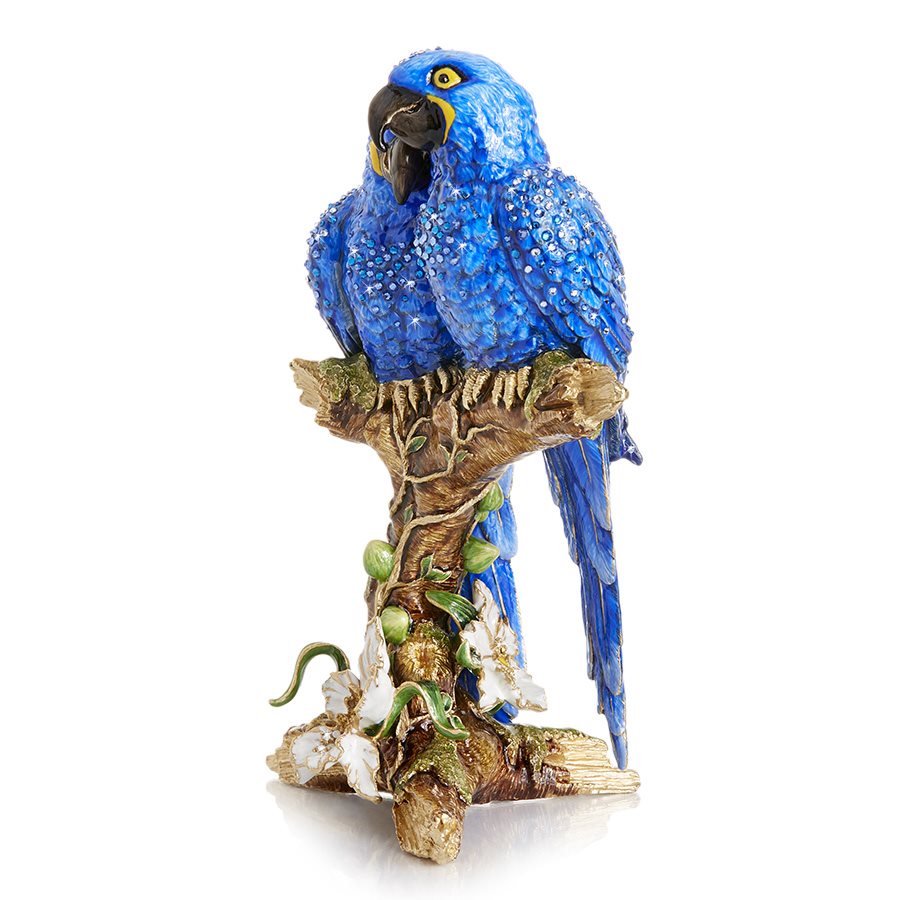 Marvelous. Jay's majestic Macaw Figurines - vividly painted in bold hues of sapphire and cobalt enamels ‚¬ €œ lovingly perched on a graceful branch with a beautiful bloom unwrapping at the base. Dazzling with thousands of hand-set Swarovski crystals in shades of cobalt, sapphire and indigo. Cast in pewter and brass, finished in 14K gold and brought to life by our finest artisans in Rhode Island.