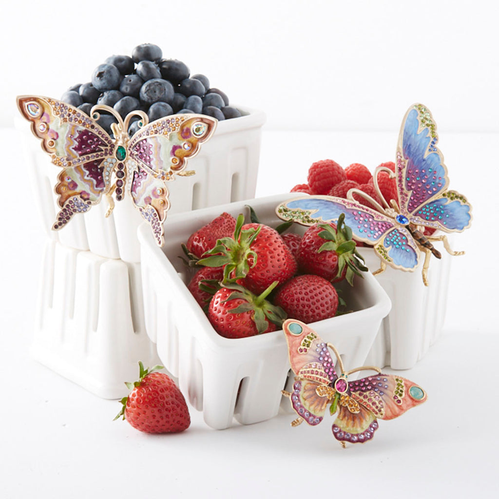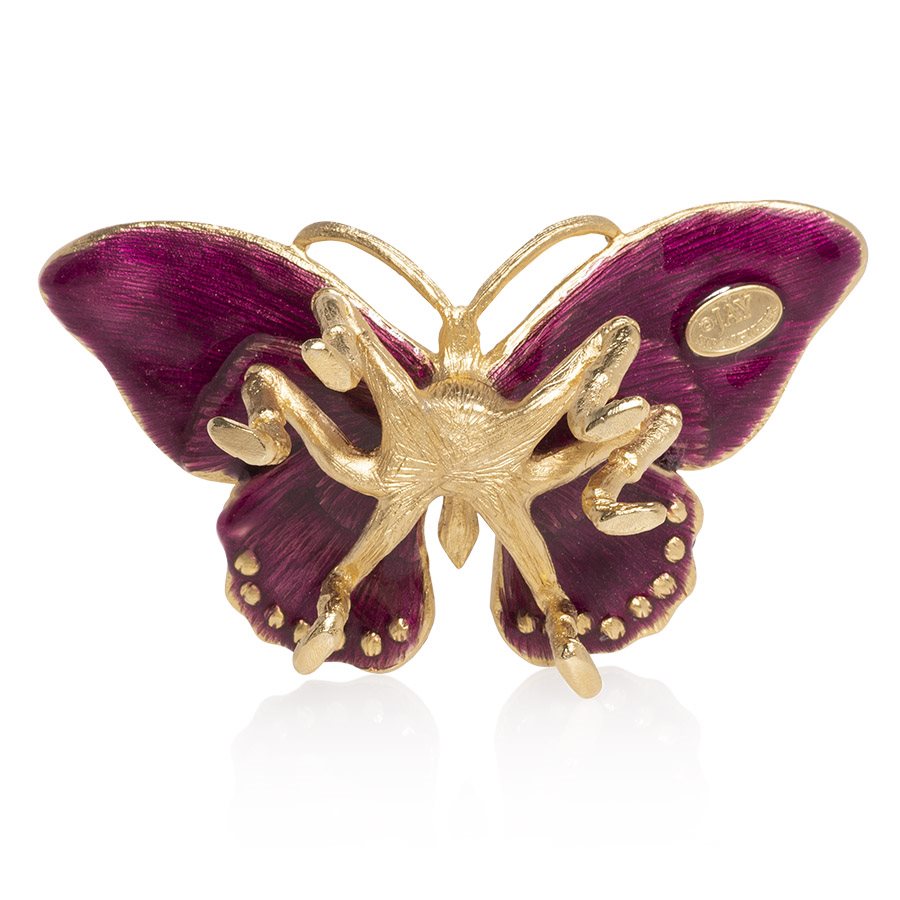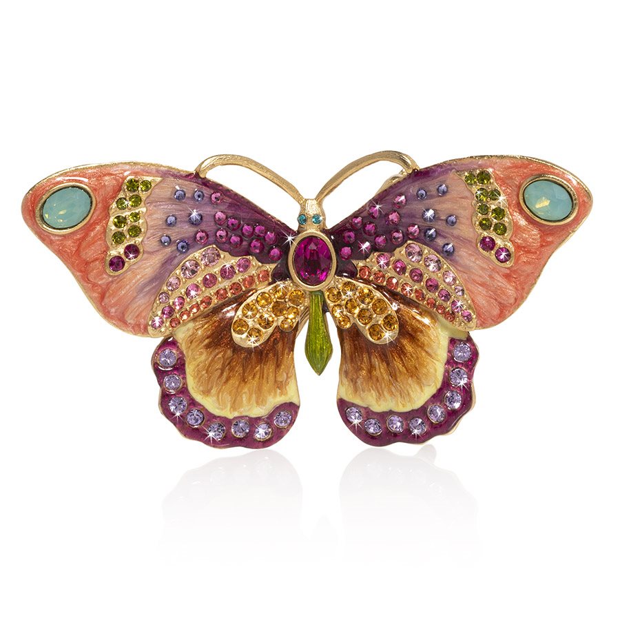 A jeweled fluttering butterfly to alight a tabletop anywhere in your home ! Lifted on delicate metal legs, the Madame butterflys wings are beautifully hand-painted in ombre gold, lavender and rose enamels with hand-set Swarovski crystals in shades of fuchsia, olivine and topaz. Carved in metal, finished in 14K gold and detailed with a jeweler's attention to crystal stone setting including large faceted oval fuchsia and opal crystals.
