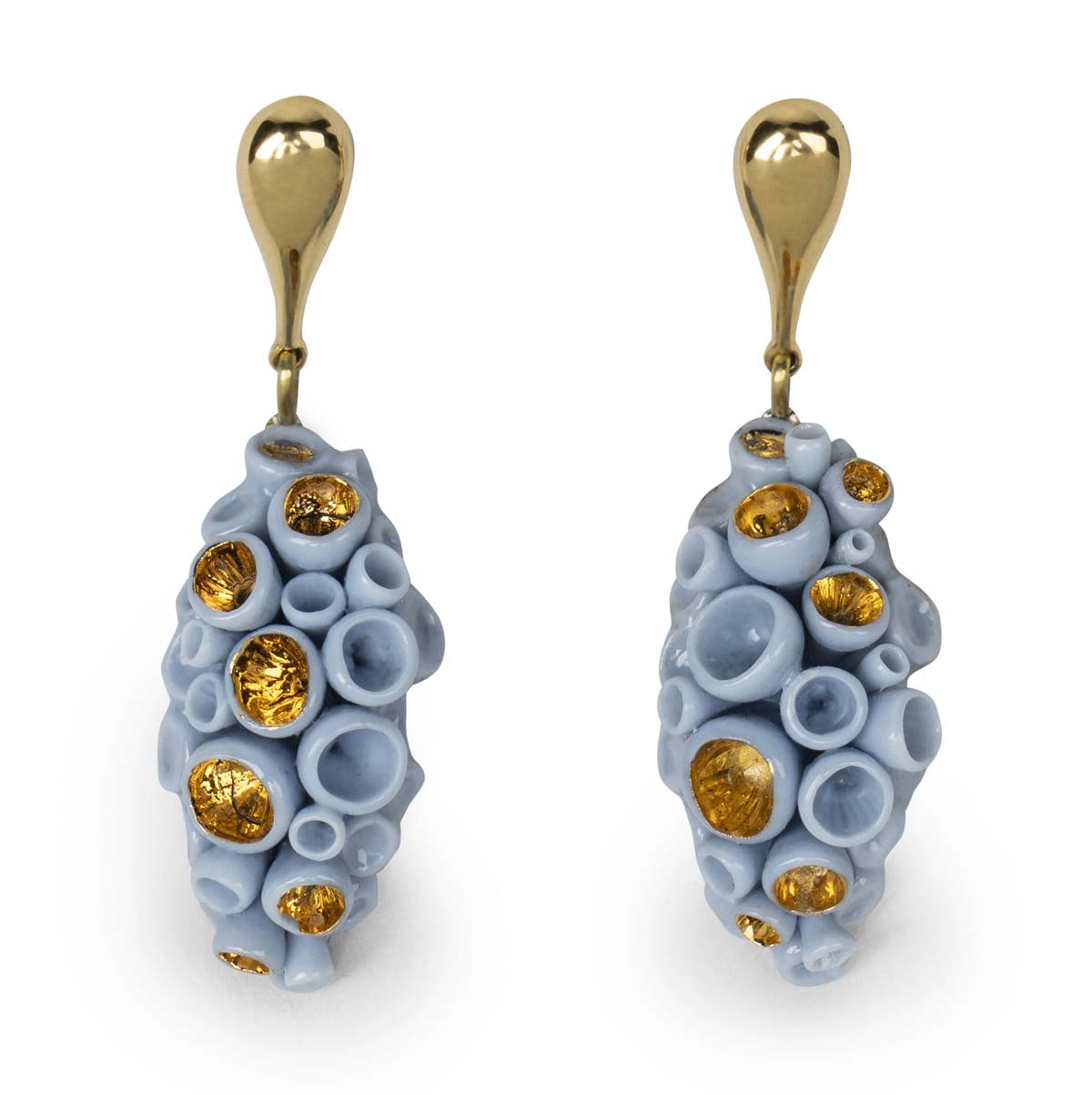 Made in glazed porcelain decorated in blue and golden luster, with all metal elements in gold-plated sterling silver. Cool and elegant creations, perfect for natural, contemporary women. Handcrafted in Spain.