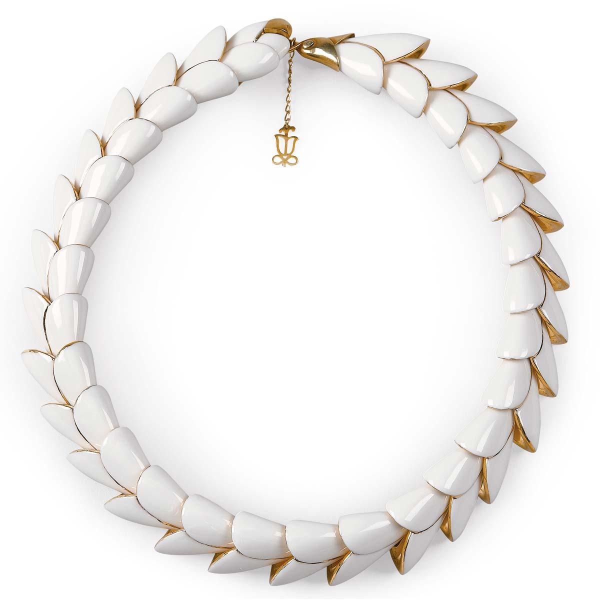 Necklace inspired by the delicacy of the Heliconia flower, composed of 28 petals of white porcelain brightness, decorated with gold luster. Clasp and internal chain in sterling silver with 18-carat gold plating.