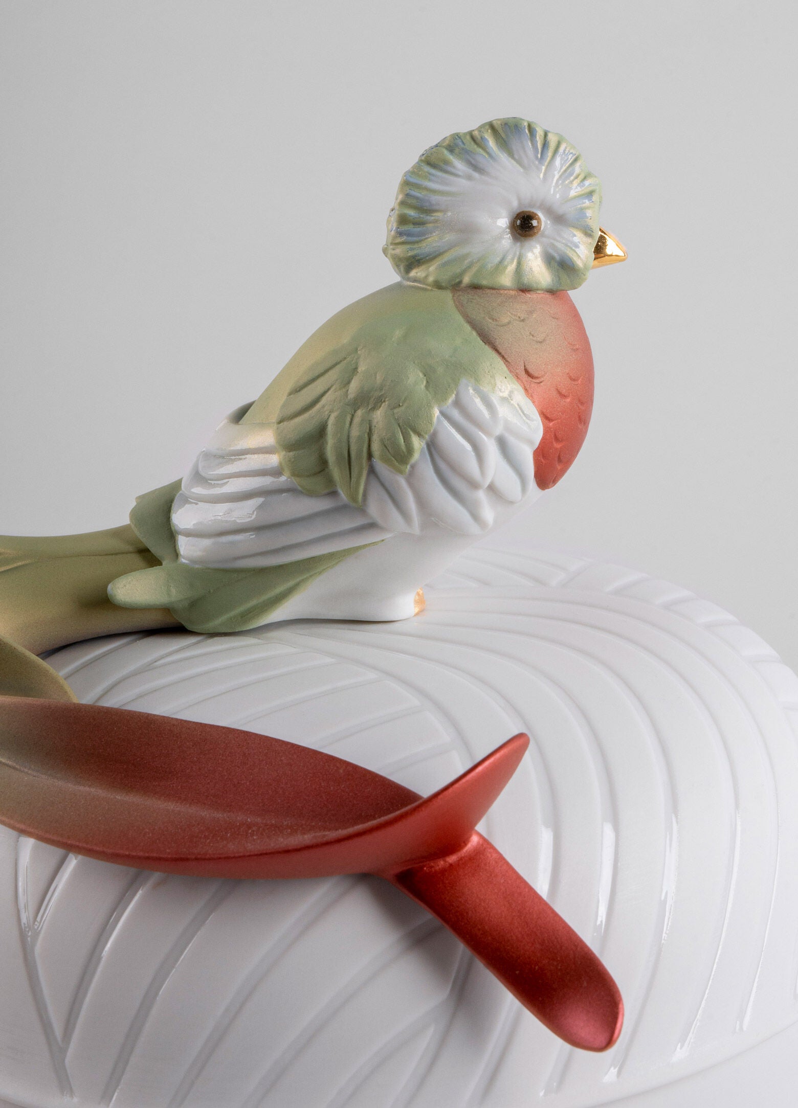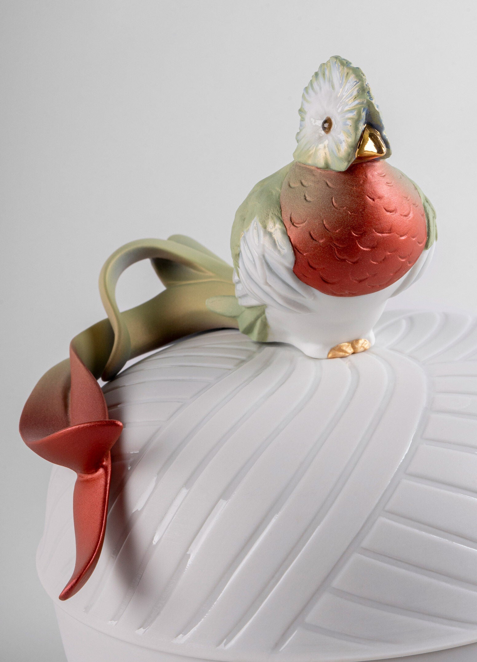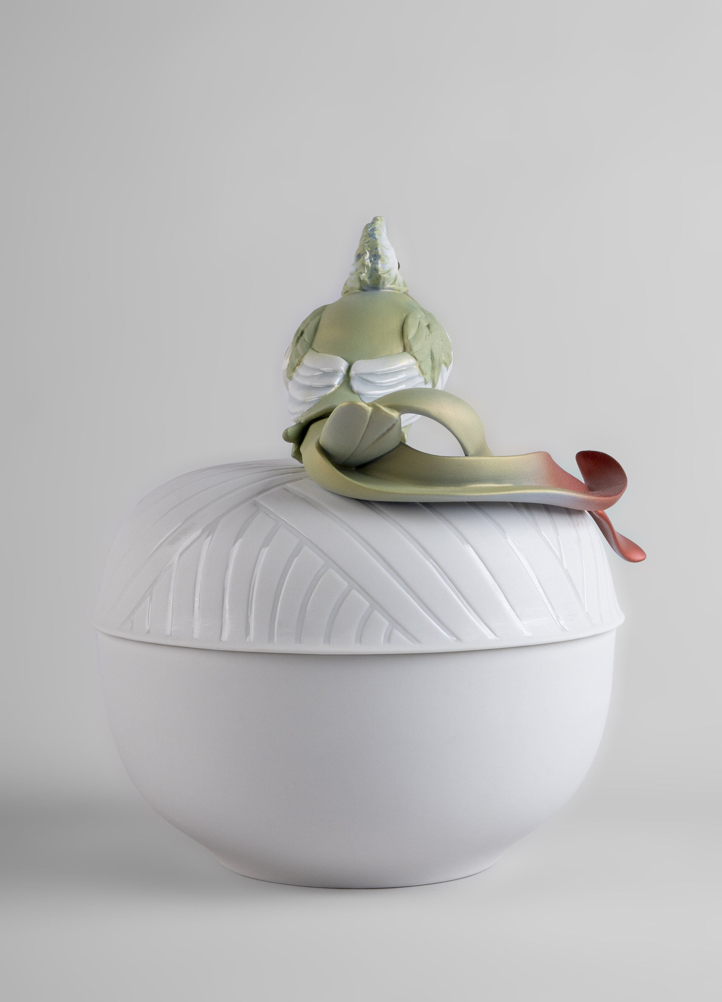 These functional objects are ornamented with beautiful creatures from tropical rainforests. In Quetzal Box the wealth of coloring of the bird contrasts with the matte holder and the varnished details underscoring etching on the lid. It is decorated with lusters and with metallic, iridescent pigments in a wide spectrum of colors. The refined treatment of the boxes and the exquisite detail of the quetzal are matched and combined in a perfect play of contrasts.
