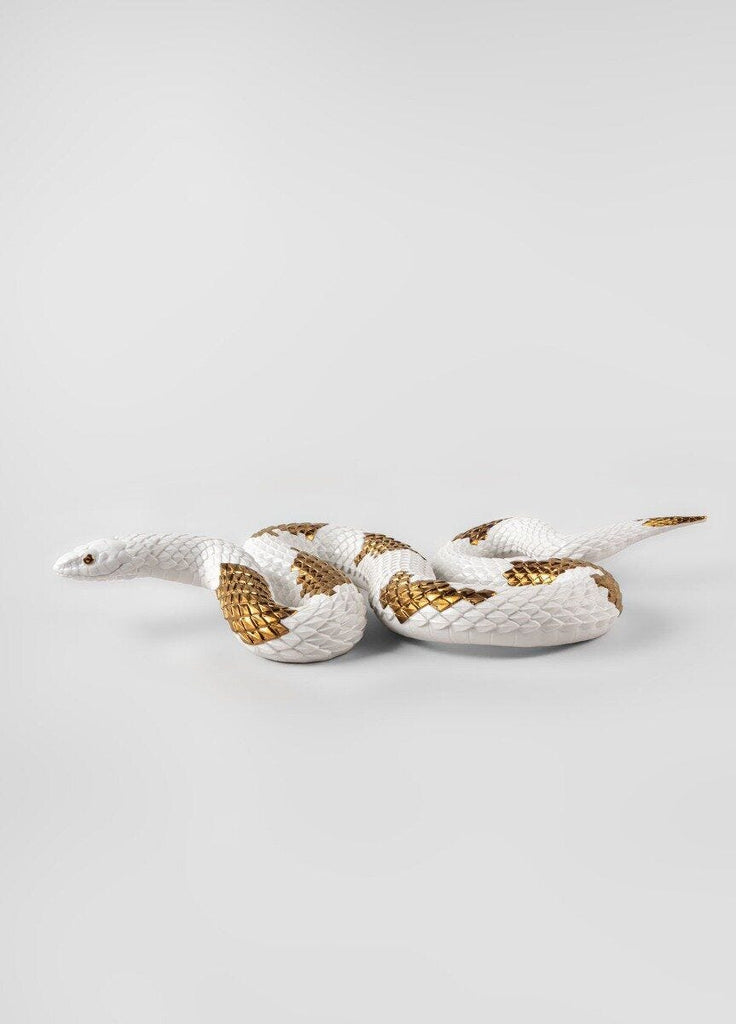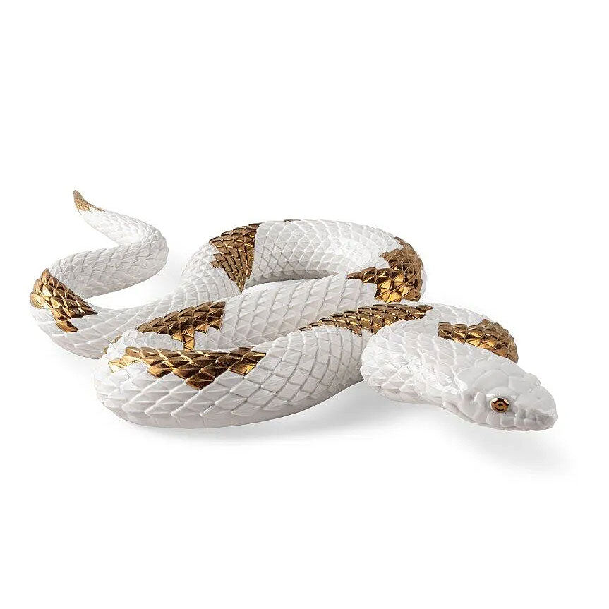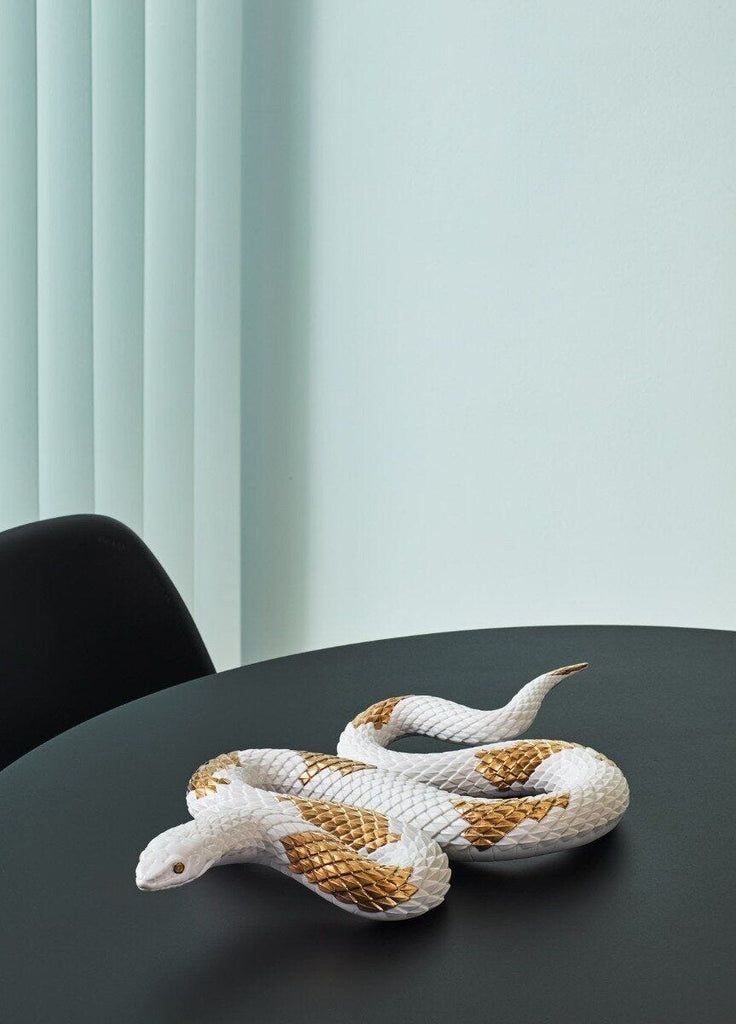 There are few creatures in nature with such strong symbolic and emotional connotations as the snake. Since time immemorial the snake has represented our fears and fantasies and our fascination with the unknown and mysterious. With its sinuous, undulating lines and its penetrating, magnetic gaze, this snake is both captivating and unsettling. Exquisitely modelled down to the tiniest detail, the white porcelain underscores the particular texture of its skin, in this decoration contrasting with the copper luster of the details, also used to highlight its eyes.