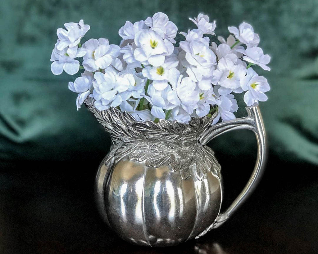 We hope the charming design of Vagabond House's Heirloom Tomato Pitcher makes it exactly that in your family's kitchen. Crafted in the shape of a tomato, our pure-pewter pitcher features an intricate wreath of leaves around its neck and mouth, while a handle emerges from the back of this decorative design. The detailed foliage gives the container a jagged rim, which contrasts beautifully with the smooth texture of the fruit.