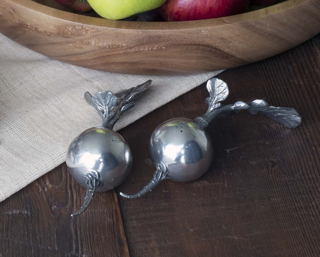 As if freshly pulled from the garden, these pure-pewter statuettes feature skinny rootlets extending from the main, globular taproot. Intricate leaves protrude off each radish's stem, while the shaker holes display near the top of these figural vegetables.
