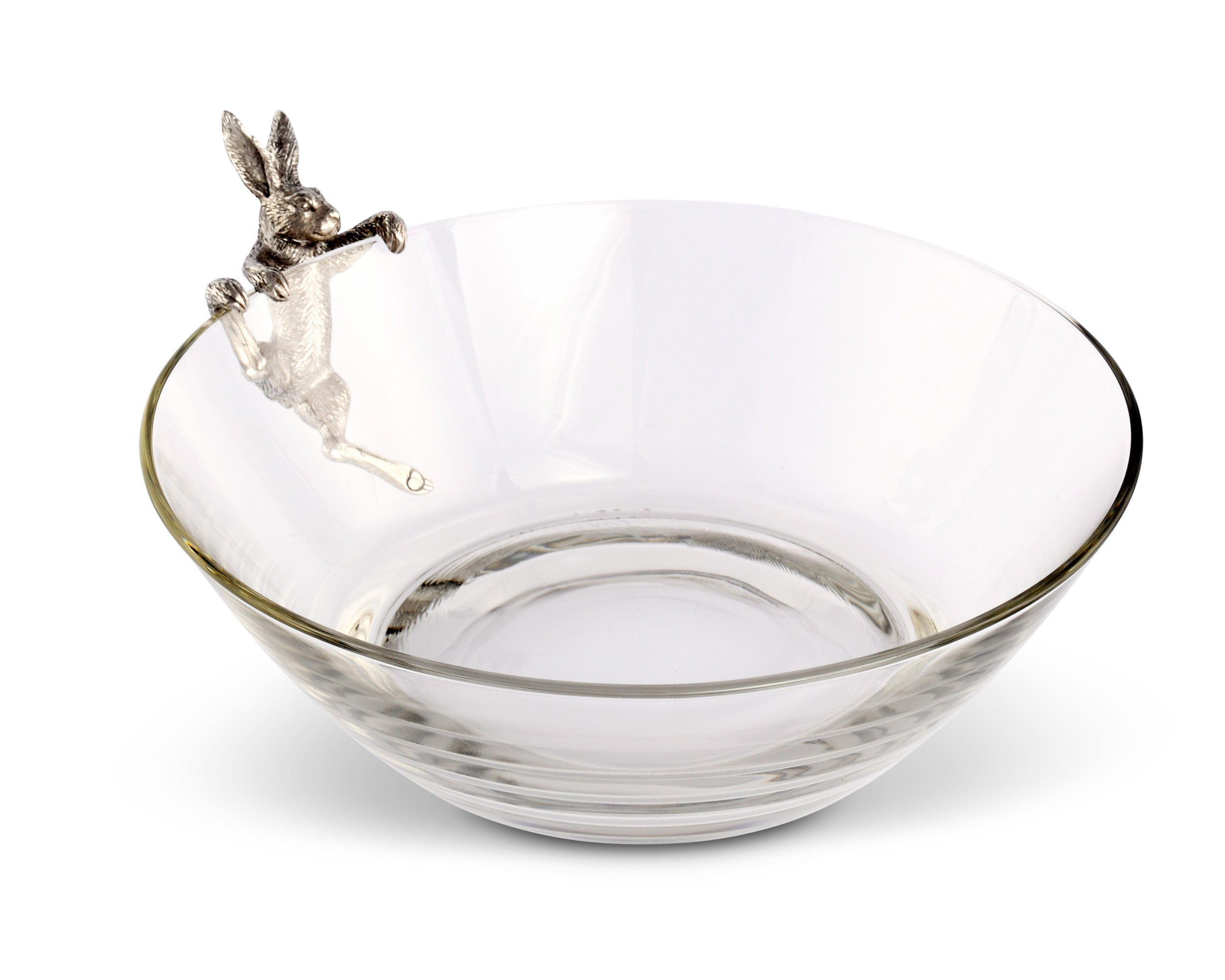 Bring the warmth of laughter to your home with the lighthearted style of this Vagabond House Climbing Bunny serving bowl. Handcrafted from the highest quality materials and covered in lifelike detail from the tips of his long ears to the toes of his dangling paw, this solid pewter bunny and his mischievous antics serve as the perfect conversation starter during Easter dinners or spring gatherings. Enchant family and friends with a tabletop display of bunny-shaped candies and cookies or a mantel centerpiece of beautifully dyed eggs. The clear glass of this generous 10 x 10 x 5-inch serving bowl creates a elegant presentation for your offerings. A natural choice for mixtures of colorful vegetables and salad dressings, its thick sides and adorably curious bunny transform even simple side dishes into table highlights.