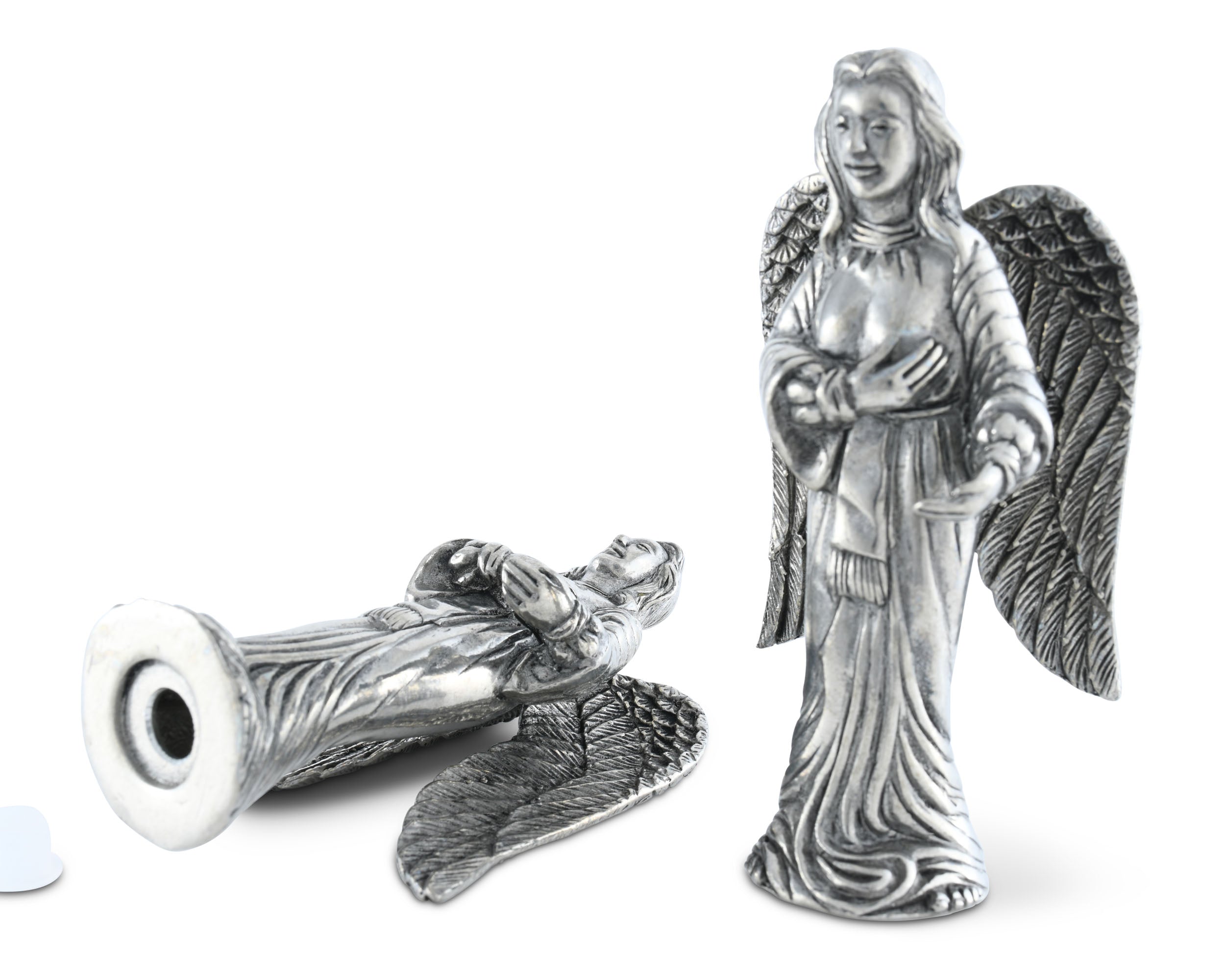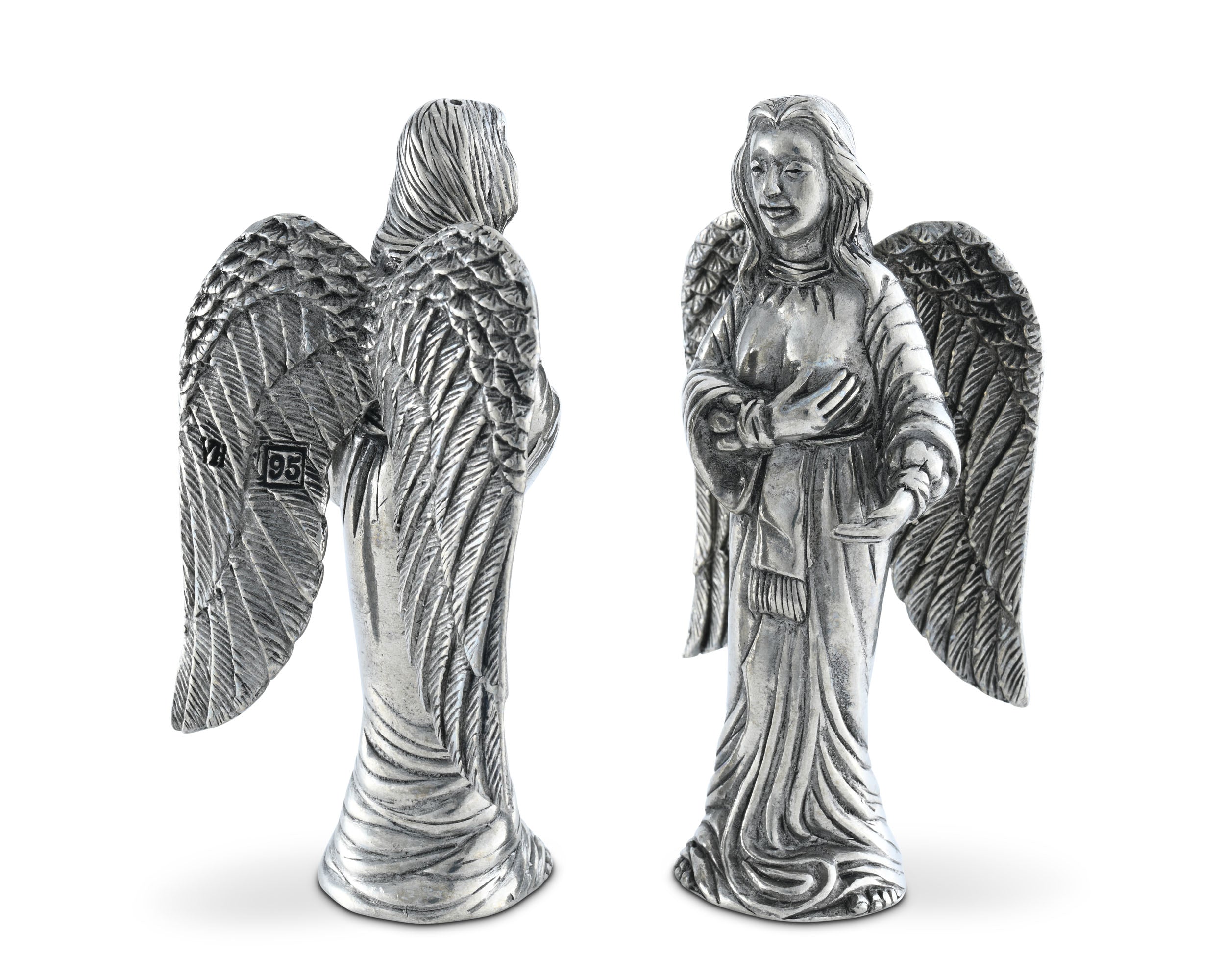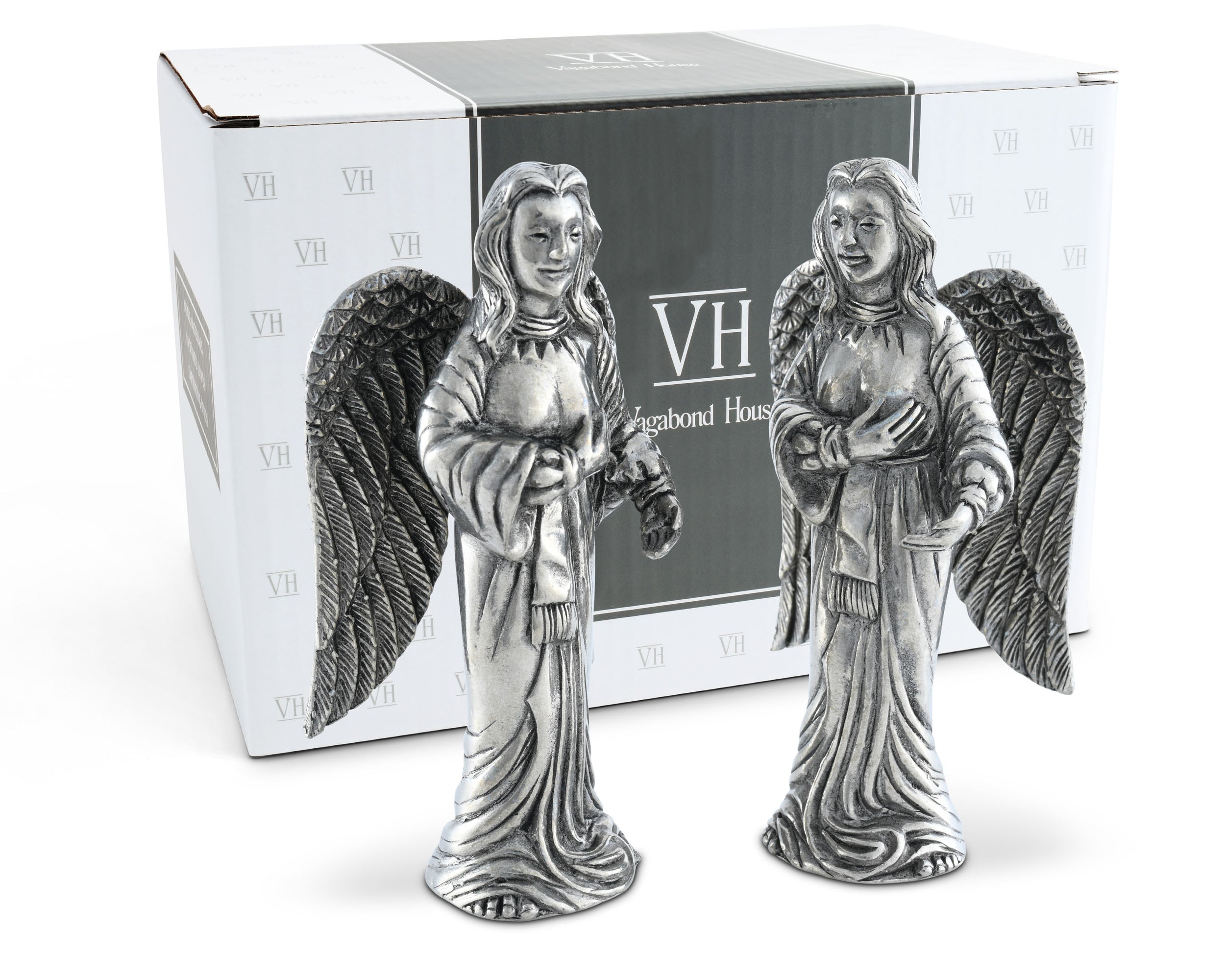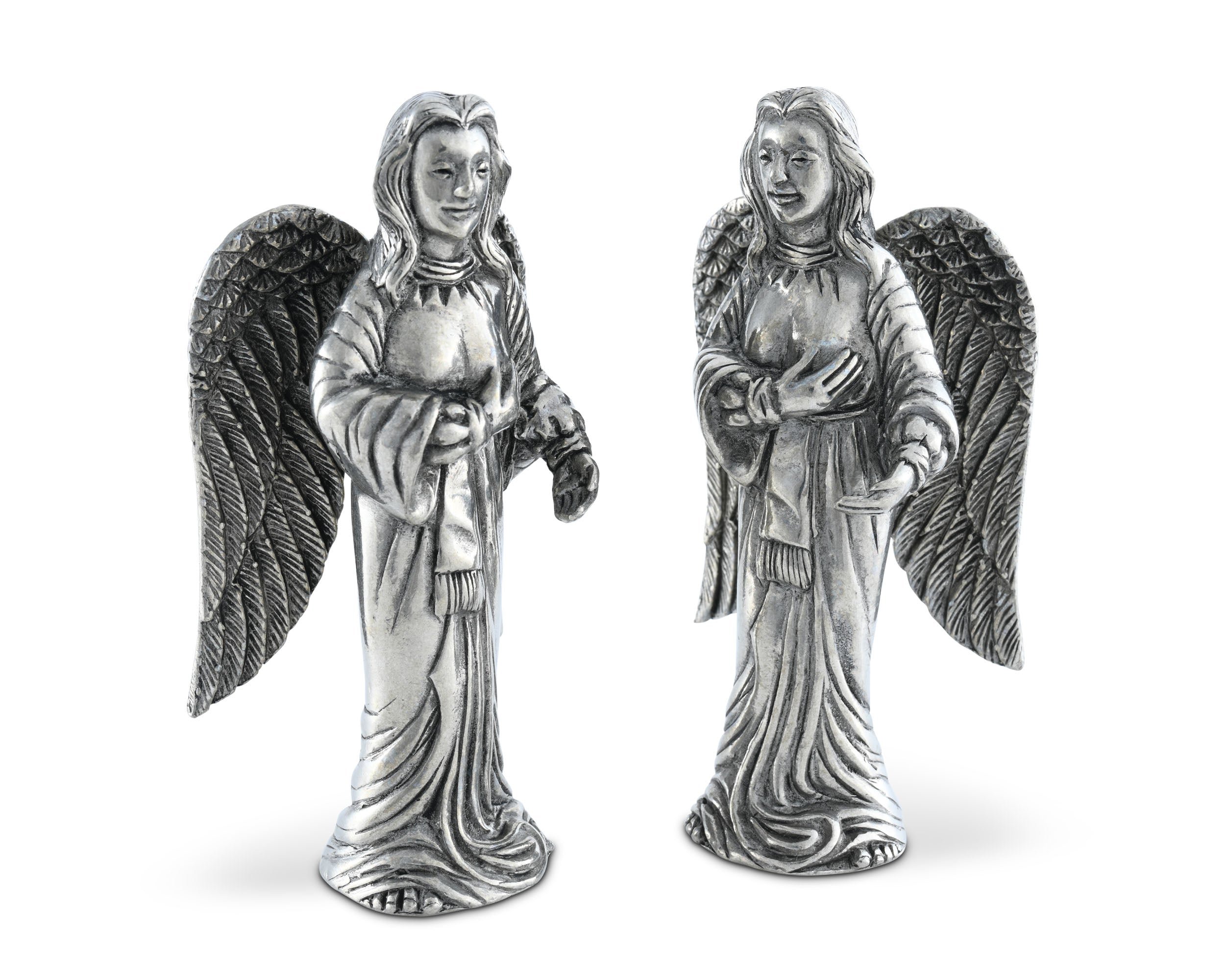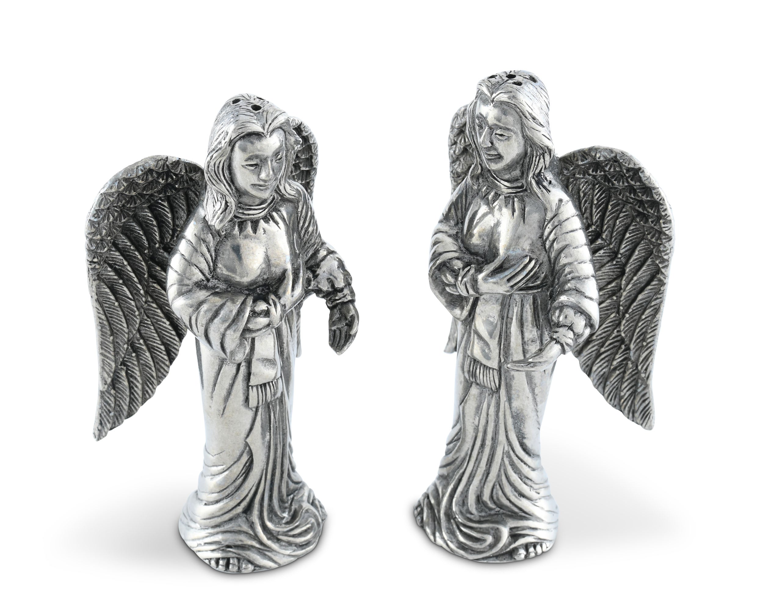 Watch over the food and company at your table with Vagabond House’s Angels Salt and Pepper Set. These pewter figurines exhibit tremendous detail in their large wings, rippled clothes and long hair. Each woman places one hand over her heart as if to bless your table with good fortune.