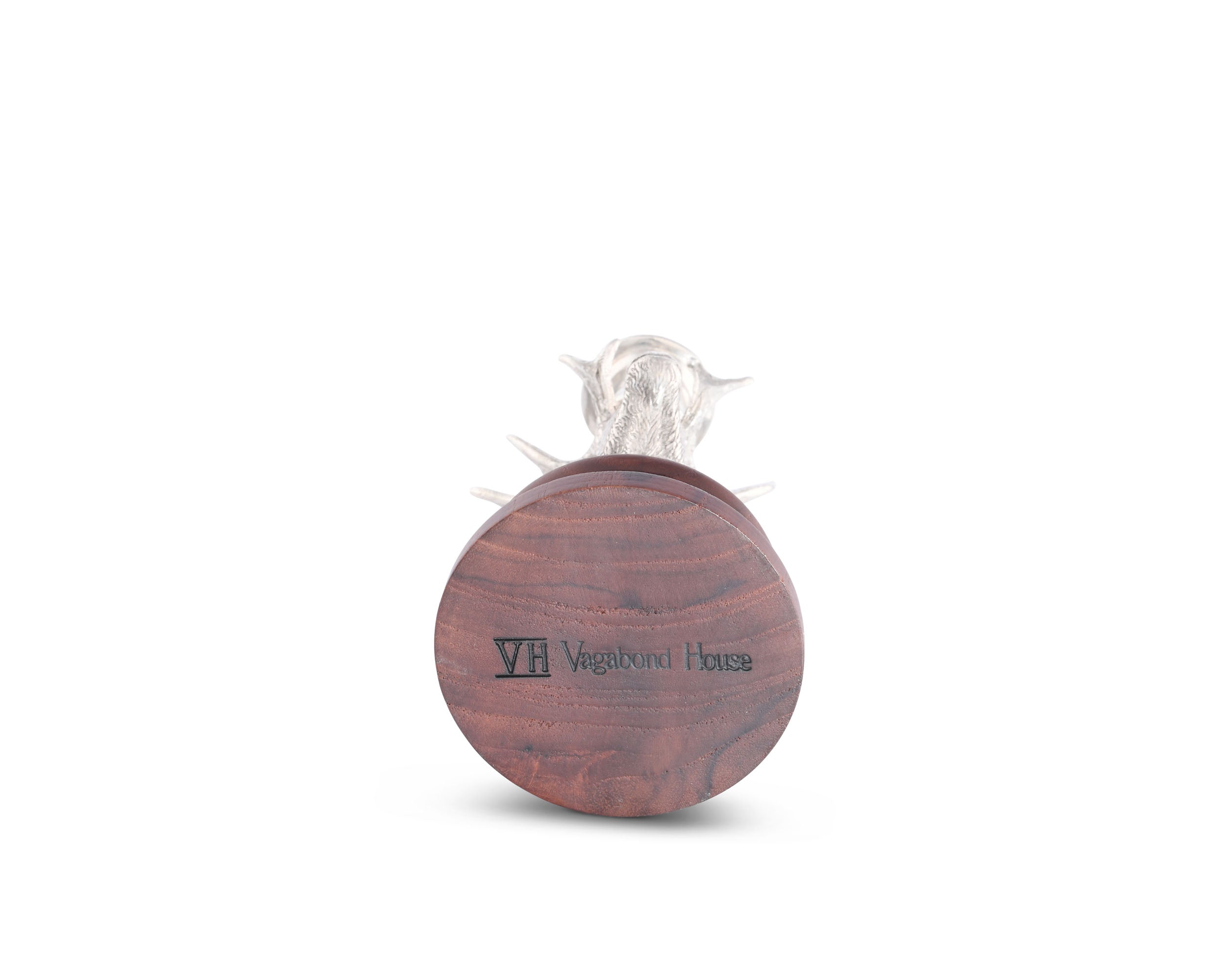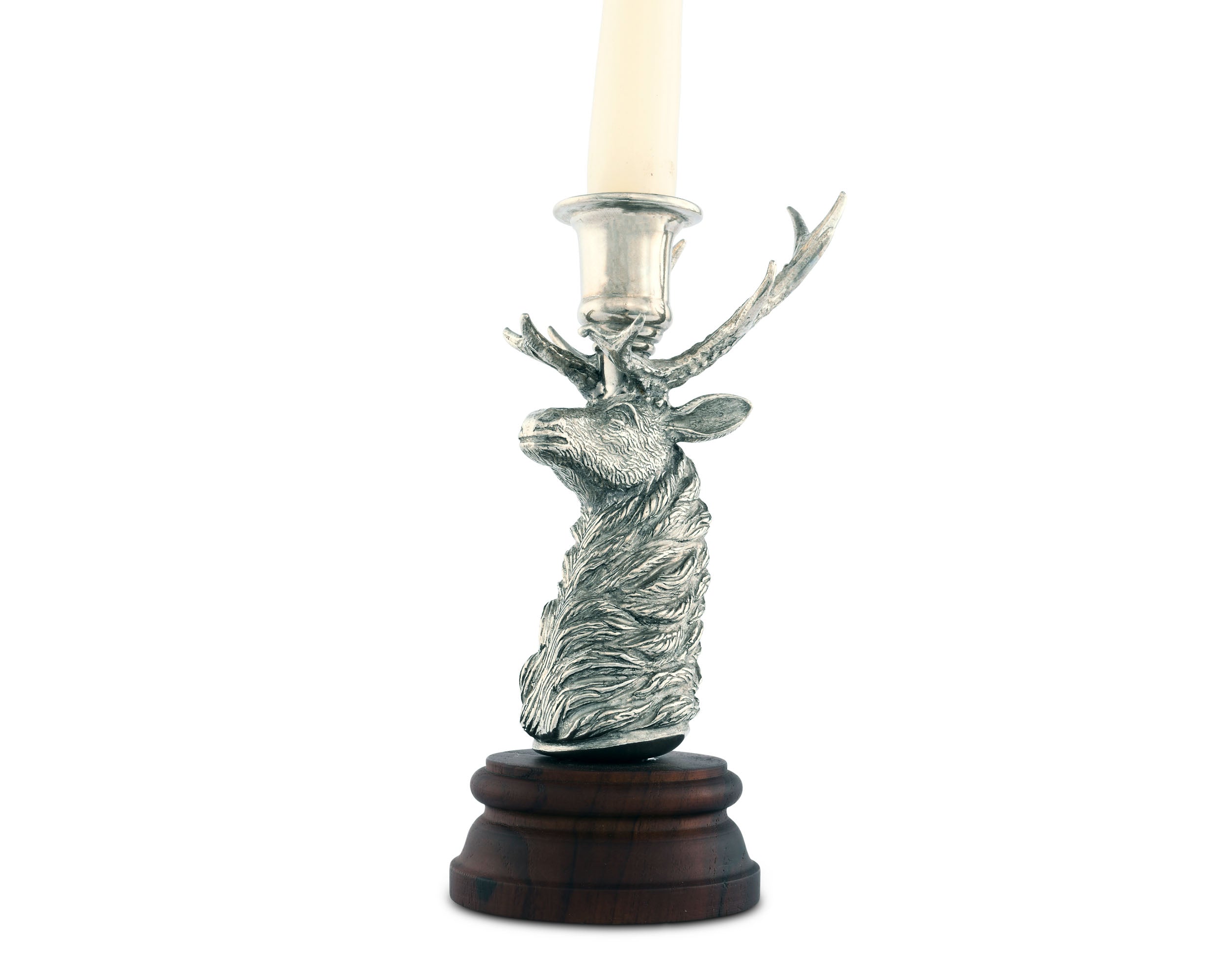 Light up your life with a touch of the wild, Vagabond House's Pewter Elk Single Candlestick will bring to light your love of the great outdoors and the wild creatures who share it with you. A deeply detailed pewter statuette of a noble Elk, sporting a full rack of magnificent antlers acts as the body of this single taper candle stick. A dark, round acacia wood base provides stability and a pewter cup holds a taper candle. A pair of these art object candlesticks set the scene for a perfect, lodge style mantle, a single piece on a favorite small table with a few small, beloved tokens, books or gathered nature makes a big statement of your personal, traditional style.