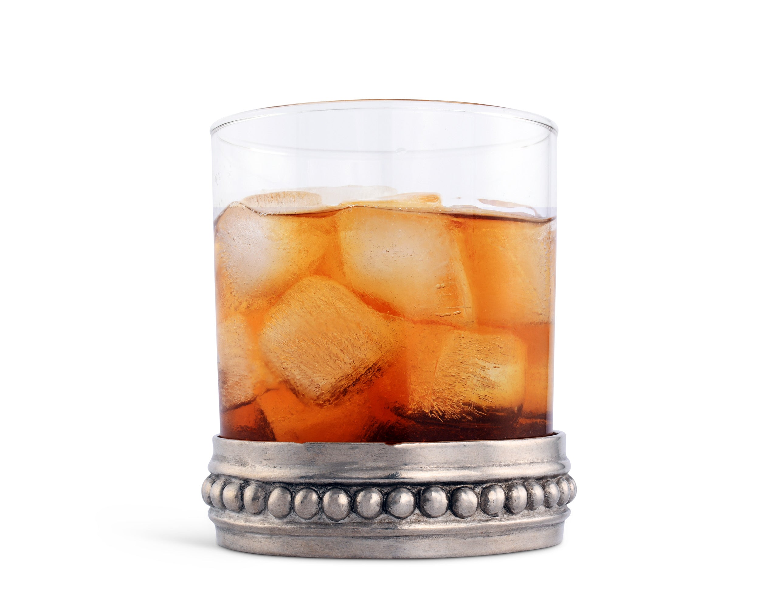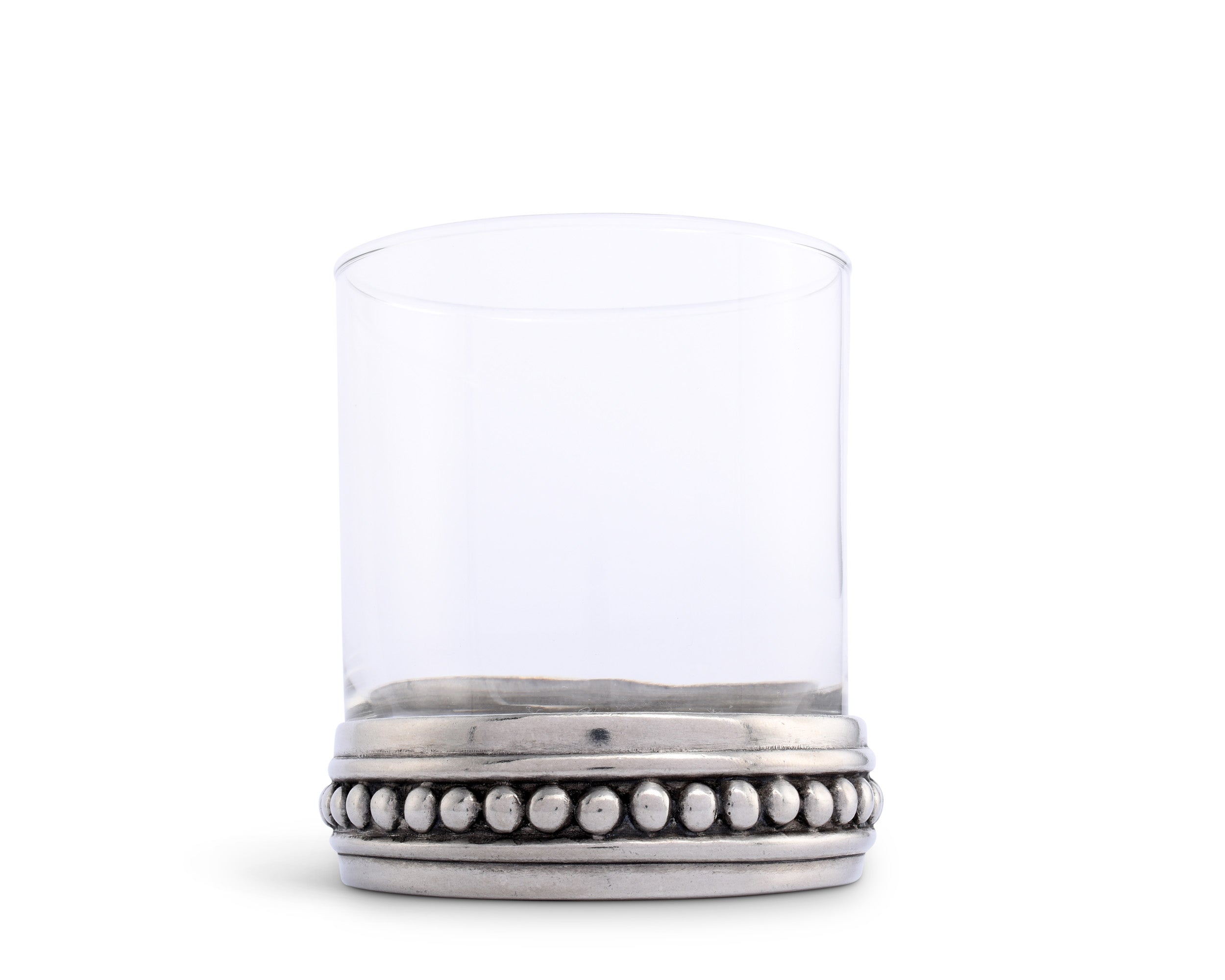 Our Medici Low Ball Glass is crafted from elegant clear glass nestled in a ring base of beaded pewter. These unique glasses are a declaration of modernized renaissance style. Spare and elegant, the pewter base adds a whisper of ornate