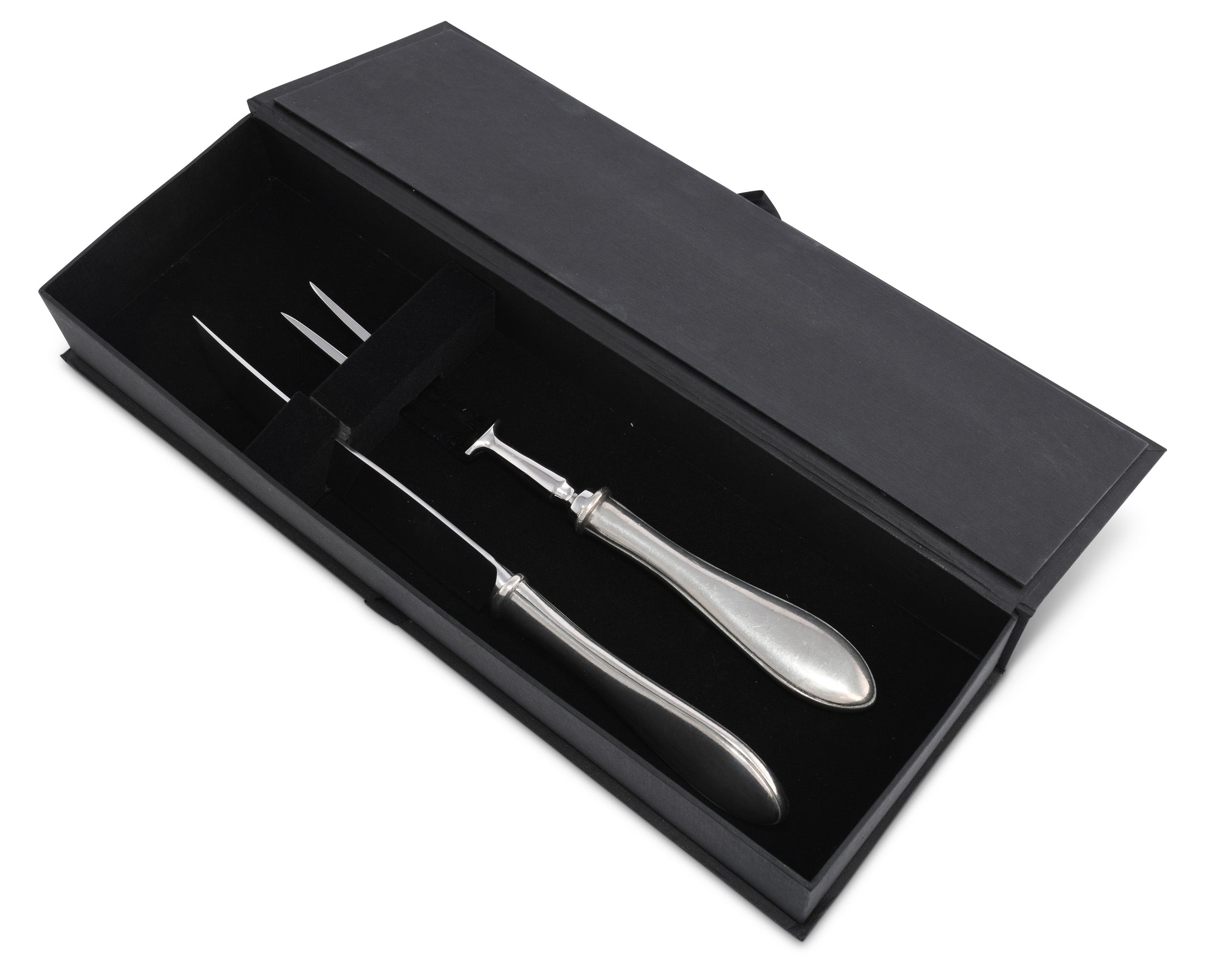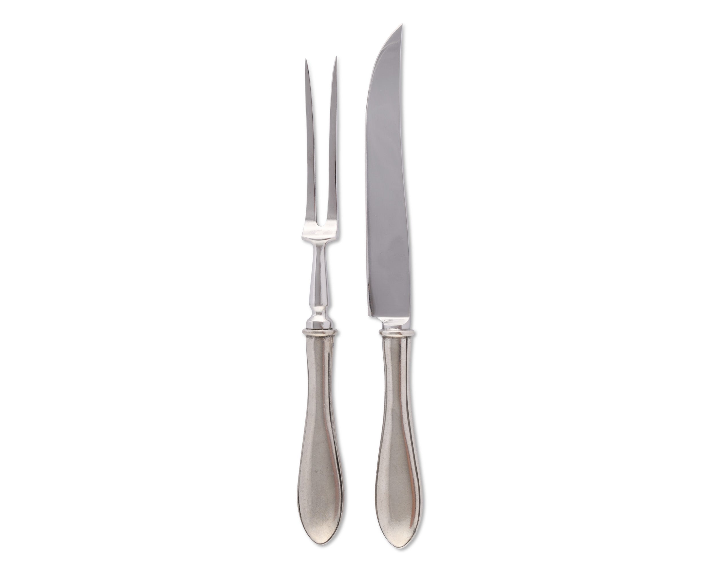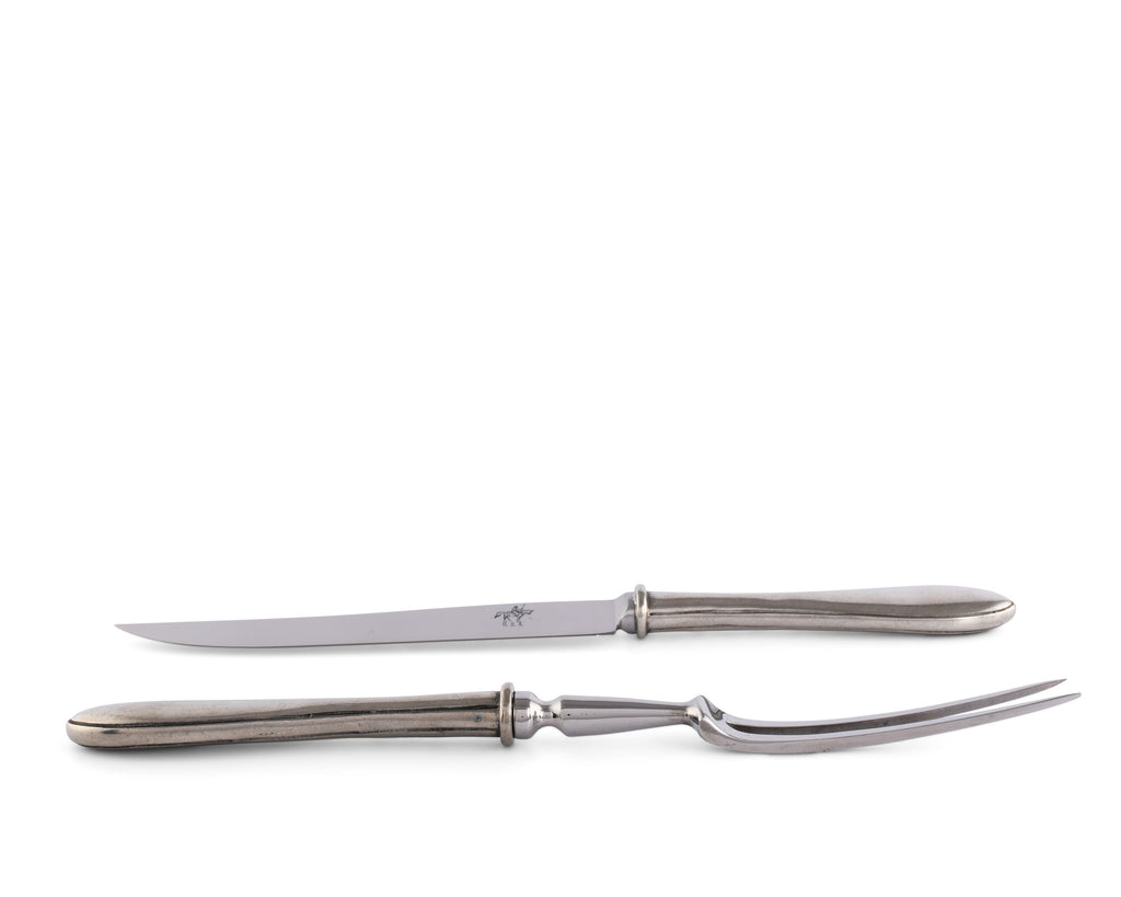 Striking and simple, Vagabond House's Wales Carving Set offers functional elegance to your formal dining experience. Crafted in luxury-grade pewter, the handles feature banded grips, which curve into a rounded points at the end. A stainless steel blade and fork give this piece a sophisticated finish.