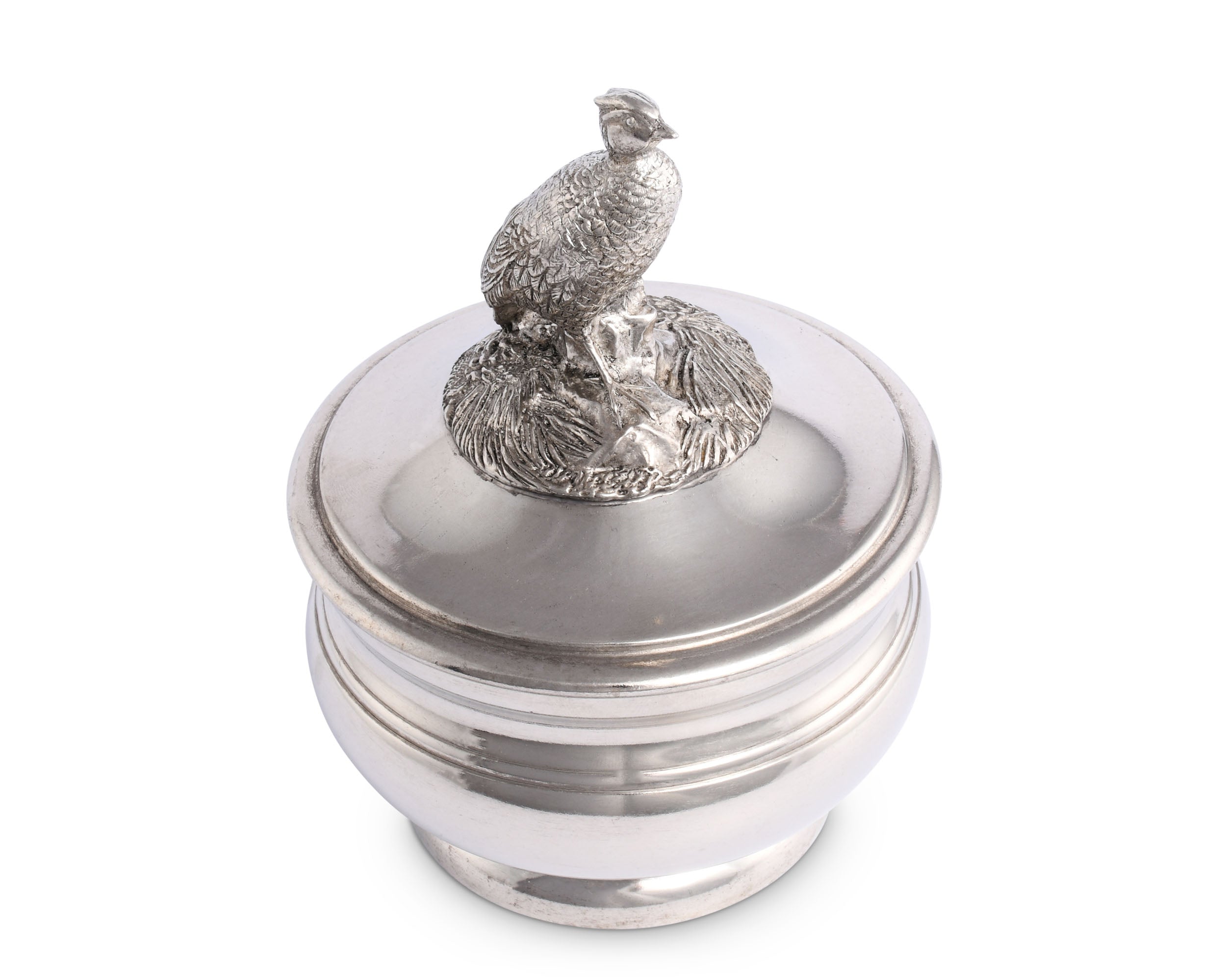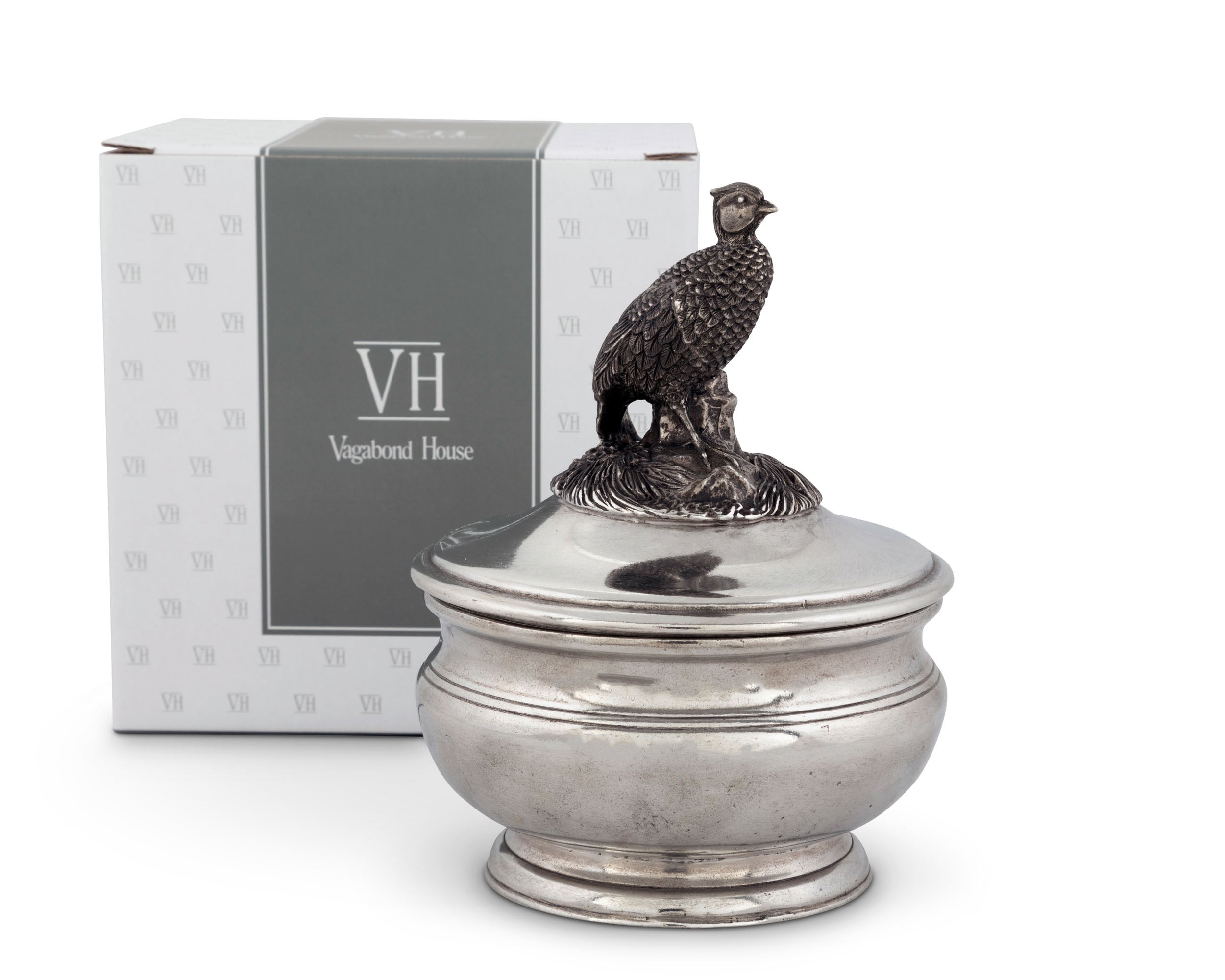 A finial of an exquisitely detailed female pheasant stands atop her nest on the lid adding unique Vagabond House style as a figural handle. The bowl is sparely tooled in classic style cast with a slight indent curve near the top and a round stacked ring base. The cover ensures that your sauce will stay fresh and the conductive properties of pewter ensure that a cool sauce will be cool and a warm one will stay warm for your entire meal.