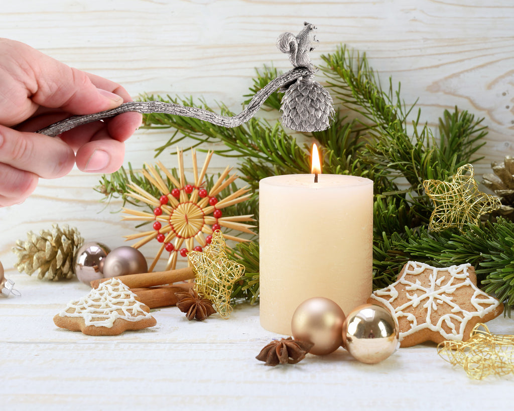 An energetic squirrel clutches onto one of his precious nuts as he stands at the end of a long, curvy branch that is the handle. The figural wood attaches to the base of an acorn, which serves as the snuffer. This pure-pewter design displays striking realism in the squirrel's intricate fur and the cupule's pattern of scales.
